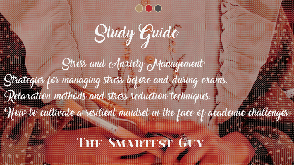 The "Stress and Anxiety Management Guide" offers effective strategies for handling stress and anxiety in academic settings. It provides insights into managing exam stress, incorporating relaxation techniques, and fostering resilience in the face of academic challenges. By implementing the techniques outlined in this guide, individuals can better cope with stress, maintain focus during exams, and develop the mental resilience necessary for academic success. Whether preparing for exams or seeking to manage stress in daily life, this guide serves as a valuable resource for individuals striving to navigate academic pressures with confidence and resilience.